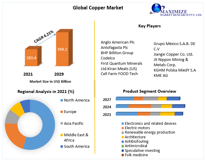 Global Copper Market was valued at US $ 283.4 Billion in 2021, and it is expected to reach US $ 394.21 Billion metric tons by 2029 with a CAGR of 4.21% during the forecast period.